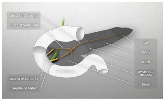 The pancreas is a secondary retroperitoneal organ located in the upper part of the abdomen. Macroscopically, it has conventionally been divided into three main parts: the head, the body, and the tail [1]. Anatomically, some structures such as the uncinate process are commonly regarded as parts of the head, which is located below the superior mesenteric artery and vein, and the neck, situated above those vessels [2,3]. The head is surrounded by a loop of the duodenum. The body, extending almost perpendicular to the median plane, is located below the stomach. It crosses the superior mesenteric artery and vein, the abdominal aorta, the inferior vena cava, and the hepatic portal vein. Finally, the tail approaches the hilum of spleen.
