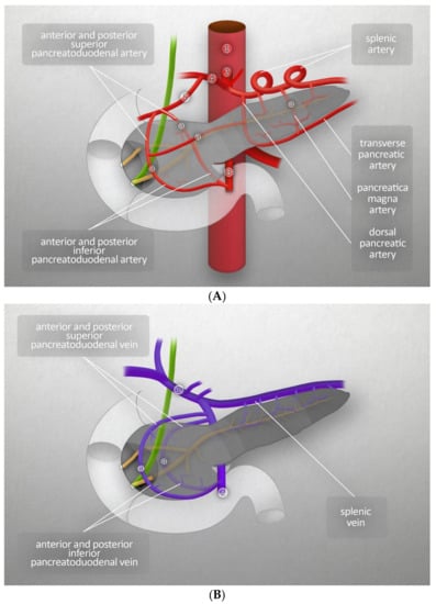 The amount of blood reaching the pancreas is about 1% of the cardiac output. The arterial supply comes from two branches of the abdominal aorta: the celiac trunk and superior mesenteric artery. The head of pancreas is supplied through the anterior and posterior arcades. The anterior arcade consists of the anterior superior pancreaticoduodenal artery (PDA), an indirect branch of the celiac trunk (it stems from the gastroduodenal artery, which is a branch of the common hepatic artery, itself a branch of the celiac trunk), and the inferior superior PDA, which is a branch of the superior mesenteric artery. The posterior arcade is formed by the posterior superior PDA, the first branch of the gastroduodenal artery, and the posterior inferior PDA, which stems from the superior mesenteric artery. The body and tail of the pancreas are supplied by the pancreatic branches of splenic artery and dorsal pancreatic artery (the latter branching from the celiac trunk near its origin), the common hepatic artery, or the splenic artery. On its right side, the dorsal pancreatic artery forms anastomoses with the anterior superior PDA, while its left branches form the inferior pancreatic artery. It runs along the inferior border of the organ and often connects to the great pancreatic artery, the largest branch of the splenic artery that supplies the pancreas. Venous blood from the pancreas flows into the hepatic portal vein. The venous vascularization of the head is similar to its arterial vasculature. The venous vascularization of the body and tail is more variable than the arterial; venous blood flows mainly into many small branches of the splenic vein [3]. Figure 2A,B present major blood vessels of the pancreas. Those figures also show the vascularization of the head of the pancreas by the anterior and posterior arcades, both arterial and venous, and the origins of the branches that merge to form those anastomoses [3].