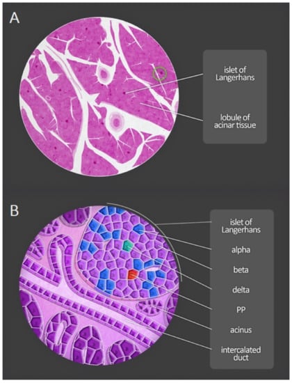 Microscopic anatomy of the human pancreas. (A) Magnification of a portion of the pancreas shows both lobules and pancreatic islets. (B) At greater magnification, acini and excretory ducts are visible. Different types of endocrine cells composing the pancreatic islets can be distinguished by immunofluorescent staining. PP—pancreatic polypeptide cells.