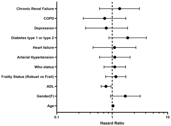 By univariate Cox regression, type 2 diabetes mellitus (crude HR 2.33, 95%CI: 1.20–4.54) and decreasing ADL (crude HR 0.68; CI: 0.59–0.79) emerged as significantly associated with all-cause mortality whereas, after adjustment for potential confounders, the adjusted mortality risk declined with increasing pre-morbid ADL (adjusted HR 0.77; 95%CI: 0.63–0.95) (Figure 1).