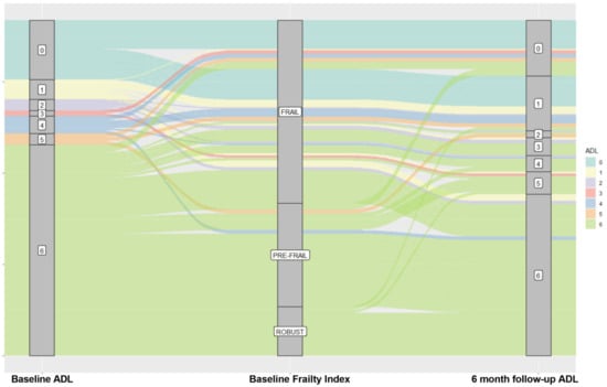 Modifications of ADL according to Frailty Status at 6-month follow-up. Alluvial Plot.