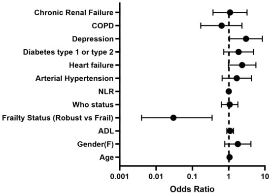 Furthermore, AL patients were almost two-fold more likely to have a history of depression than controls (25% vs. 10%, p = 0.033). At multivariable logistic analysis, the adjusted risk of LOI declined with higher frailty status (robust status–crude OR: 0.04, 95%CI 0.01–0.34, adjusted OR 0.04, 95%CI 0.01–0.35), while depression failed to reach statistical significance after adjusting for confounders (crude OR 3.00, 95CI% 1.05–8.51, adjusted OR 2.93, 95CI%; 0.94–9.09, (see Figure 3).