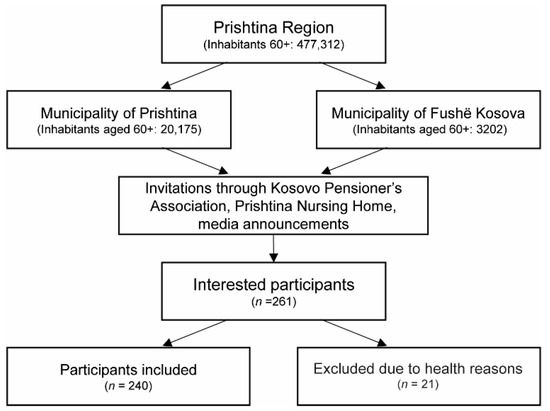 Figure 1 shows the flowchart for study participants. From the total of 477,312 people aged 60 years and older within the region of Prishtina, 20,175 and 3202 subjects from the municipalities of Prishtina and Fushë Kosova, respectively, were eligible to participate. From those, 261 expressed their interest to participate, out of whom 240 persons fulfilled the inclusion criteria and took part in the study. Data from the first 61 of these participants were used to assess the reliability of the assessment parameters and calculate diagnostic cut-off points for sarcopenia [27].