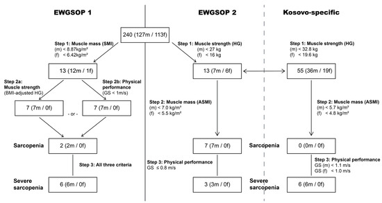 Sarcopenia case finding according to the EWGSOP1, EWGSOP2 and population-specific cut-points. EWGSOP1: pre-sarcopenia, low SMI; sarcopenia, low SMI and low HG or PP; severe sarcopenia, low SMI, low HG, and low PP. EWGSOP2 and Kosovo-specific: probable sarcopenia, low HG; sarcopenia, low HG and low ASMI; severe sarcopenia, low HG, low ASMI, and low PP. ASMI, appendicular skeletal muscle index; BMI, body mass index; GS, gait speed; HG, handgrip strength; SMI, skeletal muscle index; PP physical performance. Specific cut-points are given in the Figure. For the BMI-adjusted HG (EWGSOP1), the following values were used: males (m): ≤29 kg for BMI ≤ 24 kg/m2, ≤30 kg for BMI 24.1–28 kg/m2, ≤32 kg for BMI > 28 kg/m2; females (f): ≤17 kg for BMI ≤ 23 kg/m2, ≤17.3 kg for BMI 23.1–26 kg/m2, ≤18 kg for BMI 26.1–29 kg/m2, ≤21 kg for BMI > 29 kg/m2.