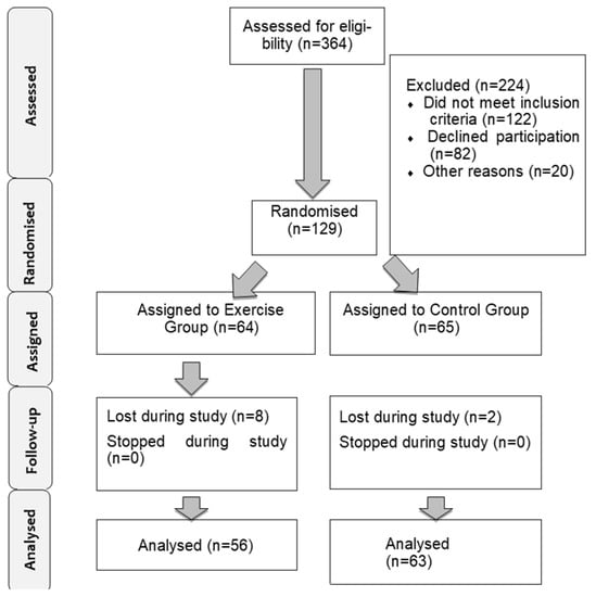 No statistically significant differences were found in baseline characteristics between the exercise (n = 65) and control groups (n = 64).