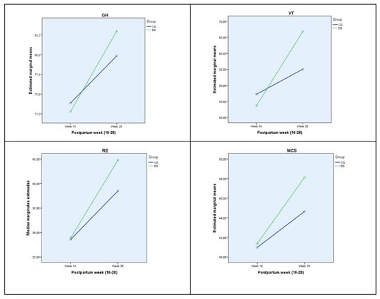 The effect of group–week interaction is significant for general health (GH), vitality (VT) emotional role (RE) and mental component punctuations (MCS). Table 2 shows the mean for each according to group and week, being in all cases higher at week 28, particularly for Exercise group. The effect of interaction is small for general health (GH) and emotional role (RE), while medium for vitality (VT) and sum of mental component punctuation (MCS). Figure 2 shows the estimated population marginal means for each group and week, with a distinct line for each group, standing out significantly in GH, VT, RE and MCS at the end of the intervention women in the exercise group who improved the scores much more than those who did not perform physical exercise in the same period.