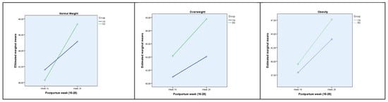 Physical component summary and: Mental component summary average score (SD) per group, postpartum week and interaction week * group according BMI. (Normal Weight: EG, n = 32, CG, n = 34; Overweight: EG, n = 17, CG, n = 22; Obesity: EG, n = 7, CG, n = 7).