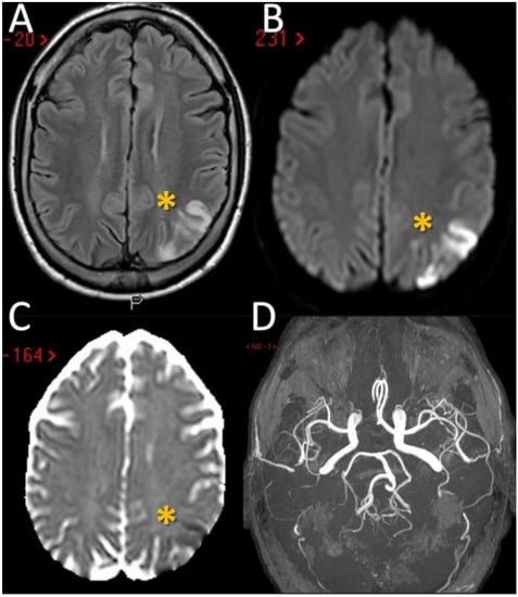 Brain MRI of the first patient. MRI of patient 1 showed the presence in the axial Fluid Attenuated Inversion Recovery (FLAIR) sequences of a wedge of cortical ischemic lesions in the left posterior parietal lobe (yellow asterisk) (A) with DWI and ADC sequences pattern suggesting acute ischemic lesions (B,C). MRA (time-of-flight [TOF] reconstruction) shows fully patent proximal intracranial arteries and right A1 anterior cerebral artery (ACA) aplasia (D). MRI: Magnetic Resonance Imaging; MRA: Magnetic Resonance Angiography; DWI: Diffusion Weighted; ADC: Apparent Diffusion Coefficient.