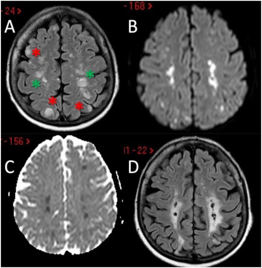 Brain MRI of the second patient. MRI of patient 2 showed the presence of multiple scattered hyperintense brain lesions on both internal border zone (green asterisk) and on cortical location (red asterisk) at axial FLAIR sequences (A) with diffusion weighted imaging (DWI) and apparent diffusion coefficient (ADC) pattern suggesting acute ischemic lesions with a metachronous timing pattern (B,C). In the follow-up MRI performed 3 months later it is evident the chronical evolution of the above-mentioned ischemic lesions (D).
