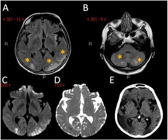 Neuroimaging studies of the third patient. MRI of patient 3 showed the presence of multiple supratentorial (A) and infratentorial (B) hyperintense lesions (yellow asterisk) with a territorial distribution in A and border zone pattern in B (axial FLAIR sequences) with DWI and ADC pattern suggesting acute ischemic lesions with a metachronous timing pattern (C,D). In the follow-up CT performed 7 days later it is evident the increased number of ischemic lesions, in particular on the right hemisphere (E).