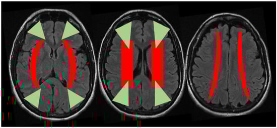 Putative location of the external (green) and internal (red) border zones superimposed on three sequential axial slices of brain MRI (FLAIR sequence). Abbreviations: FLAIR: Fluid Attenuated Inversion Recovery.