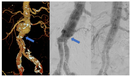 - Spanos, K.; Kölbel, T.; Kouvelos, G.; Tsilimparis, N.; Debus, S.E.; Giannoukas, A.D. Endovascular treatment of para-anastomotic aneurysms after open abdominal aortic surgery. J. Cardiovasc. Surg. 2020, 61, 159–170. [Google Scholar] [CrossRef]