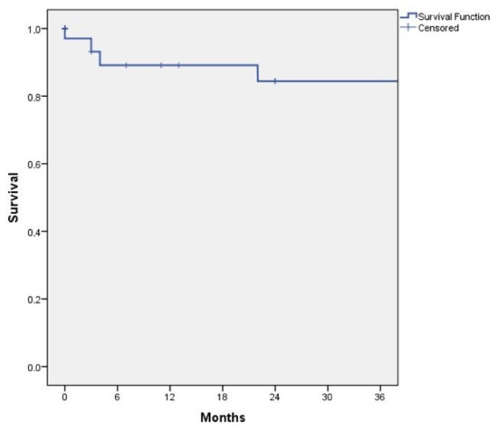 The median follow-up was 33 months (range 3–121). Estimated overall survival at 12, 24 and 36 months was 89.1% ± 6%, 84.4% ± 7.3% and 84.4% ± 7.3%, respectively. Figure 2 shows the cumulative survival curve estimated by Kaplan–Meier analysis. There was no aneurysm-related mortality in any patient during follow-up.