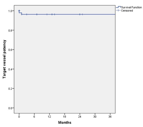 One (3%) patient presented with an occlusion of the right renal artery in the first postoperative control. The occlusion was attributed to a small dissection of the vessel that was present in the completion angiography. The patient maintained a stable renal function with a creatinine of 1.7 mg/dL. No other target vessels occluded during follow-up. There was no graft limb occlusion, nor stent graft migration. Figure 3 shows the target vessel’s primary patency estimated by Kaplan–Meier analysis.