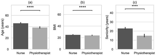 Table 1 presents the baseline characteristics of the study population across categories of nurses and physiotherapists. Compared to physiotherapists, nurses were older, shorter, and had higher BMI (Figure 1). Work experience (seniority) in the group of nurses was longer than in the group of physiotherapists.