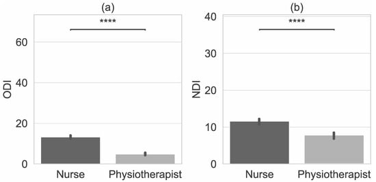 Characteristics of Physiotherapists and Nurses with error bars and p-value annotation legends (a) Oswestry Disability Index (ODI) (b) Neck Disability Index (NDI) values. ****: p <= 1.00e-04.