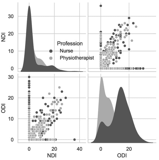 ODI and NDI scores in physiotherapists and nurses.