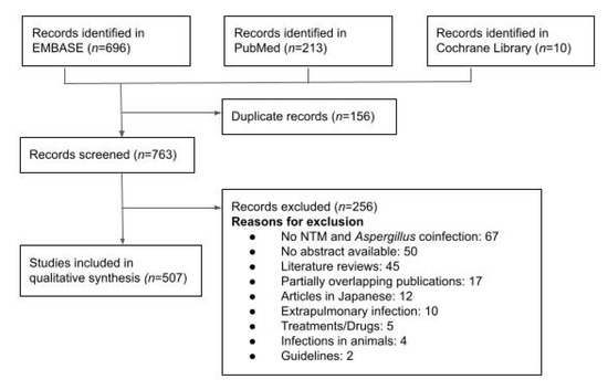Studies were excluded if they did not fulfill these criteria and included only NTM or aspergillosis cases in the absence of co-infection, extrapulmonary diseases such as skin or soft-tissue infection, or cases that were diagnosed in animals. In the case of partially overlapping publications, only the study with the highest number of individuals or the most modern series was included.
