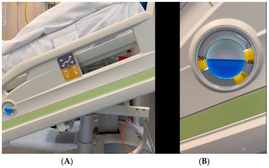 An anti-bedsore hospital bed was used to conduct this clinical study. This type of bed offers the possibility, through a lateral remote control, to lift the bedhead up to a desired angle. With a specific protractor, placed laterally to the bed, it was possible to estimate the achievement of the desired angle of the bedhead (Figure 2).