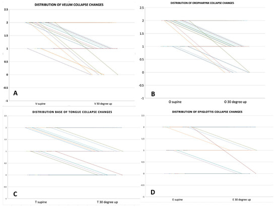In short, the changes in DISE outcomes, passing from 0° to the HOBE 30° up position, were observed in 11 patients (24.4% of cases). No changes nor minor variations in grade, sites, and type of collapse were present in 75.6% of cases. The distribution of changes related to the grade of collapse (VOTE classification) in each patient at passage from 0° to 30° up is shown in Figure 4A–D.