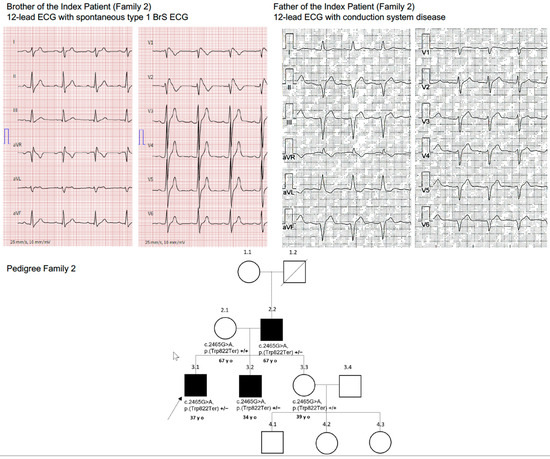 In family 2, for molecular genetic analyses the Illumina TruSight Cardio was used with DNA prep with enrichment and high-throughput sequencing (Illumina MiSeq), with 91.8% of bases sequenced with a Q score ≥ Q30. Ninety-nine percent of the analyzed gene segments had coverage of ≥20X. The average sequencing depth of the analyzed gene segments was 358.9X. Comprehensive genetic testing was performed using a custom panel of 15 candidate genes, which at that time had been associated with BrS (CACNA1C, CACNA2D1, CACNB2, GPD1L, HCN4, KCND3, KCNE3, PKP2, RANGRF, SCN10A, SCN1B, SCN2B, SCN3B, SCN5A*, TRPM4), selected from a panel of 173 inherited heart disease genes the patient was screened for, and no other suspected variant able to produce the phenotype was detected in this case within those 173 genes.
