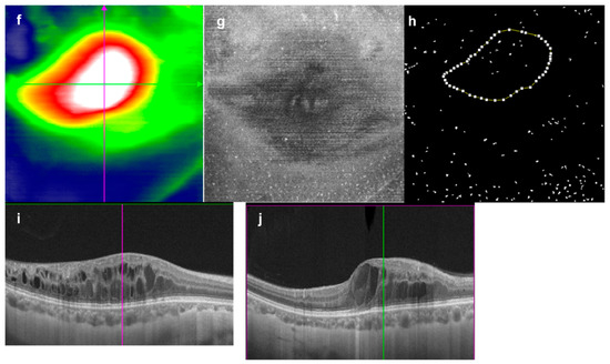 Edema regions were manually divided according to the retinal thickness distribution map created by the built-in software, version 1.36.4 (examples shown in Figure 1a,f). The red and white areas in Figure 1 were considered as edema regions, representing regions with retinal thickness greater than 440 μm. The edema region was measured semi-automatically using ImageJ software. The vessel density (VD) of the deep capillary complex (DCP), superficial capillary complex (SCP), mean retina thickness (MRT), and central fovea thickness (CFT) were also automatically measured by the built-in software of the SS-OCTA instrument.