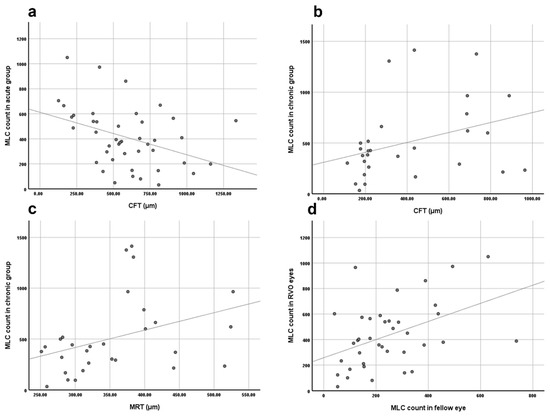 Results of correlation analysis. (a) The negative correlation between MLC count and central fovea thickness (CFT) in acute RVO eyes. (b) The positive correlation between MLC count and CFT in chronic RVO eyes. (c) The positive correlation between MLC count and mean retina thickness in chronic RVO eyes. (d) The positive correlation between MLC count in RVO eyes and in the fellow eyes.