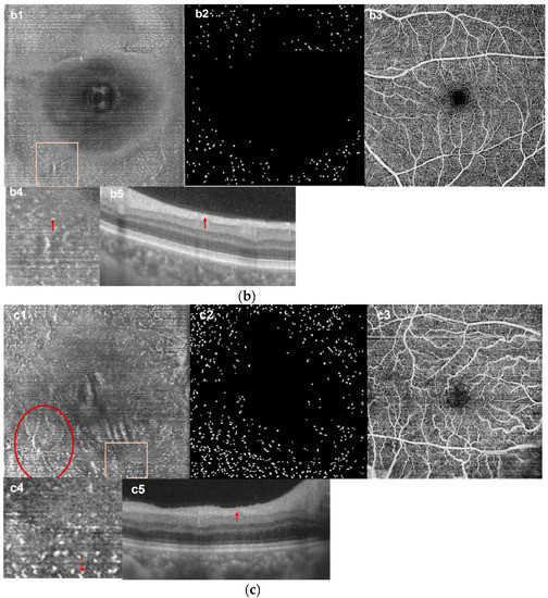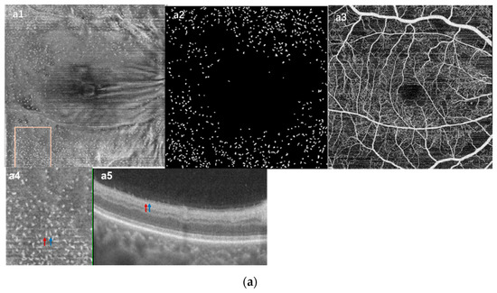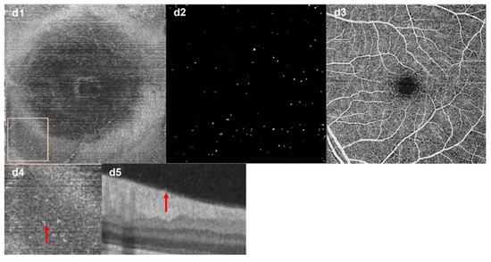 Microglia in the retina are immune cells that originate from the monocyte–macrophage system and play a role in the immune response [11,12]. Macrophages in the vitreous humor are known as hyalocytes, parts of which are located above internal limiting membranes (ILM) [13,14,15]. Physiologically, they help to keep the transparency of the vitreous humor [16]. In previous animal studies, both microglia and hyalocytes were found to be involved in retinal pathology [17] and played an important part in several retinal diseases such as glaucoma [18], diabetic retinopathy (DR) [19], uveitis [20], idiopathic epiretinal membrane [21], and age-related macular degeneration [22]. However, most of the previous research has been conducted on animal models, using staining and confocal microscopy to identify these cells. Recently, some studies have reported that macrophages located at the ILM were successfully and consistently observed in live human retinas using adaptive optics with optical coherence tomography (AO-OCT) as well as clinical-used optical coherence tomography (OCT) [23,24]. These studies also described the distribution and dynamics of the cells [24]. Furthermore, another group observed an increase in macrophage-like cells (MLCs) at the vitreoretinal interface [25]. The above studies fully demonstrate the viability of the patients’ MLCs in the clinical setting.
