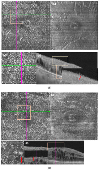 In addition to the increase in MLC numbers, we also observed morphological changes, including the increased size and signal enhancement in acute RVO eyes (Figure 3(a4,c4) vs. Figure 3(b4,d4)). Interestingly, the morphology of MLCs in chronic eyes was more remarkable. Comparing the acute group with the chronic group, we found that in some of the chronic RVO eyes (6/29), the size and number of MLCs increases greatly (examples shown in Figure 4). Furthermore, these abnormally larger cells gathered in clusters and accumulated in the macula, which was different from the normal eyes and the acute RVO eyes. On the OCT B-scans, connections appeared between the aggregated cells, which was never found in the acute eyes (Figure 4). The average disease course of the six patients was 322.7 days. All these eyes had retinal edema and underwent at least two rounds of intravitreal injection of anti-VEGF drugs and at least one round of intravitreal steroids.