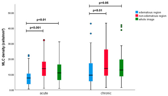 Comparison of MLC density between edematous area, non-edematous area, and whole image in the acute and chronic groups. In the acute group, MLC density reduced significantly in the edematous region compared with the non-edematous region and the whole image. In the chronic group, the MLC density reduced significantly in the edematous region compared with the non-edematous region. There was no significant difference in MLC density between the edematous region and the whole image in the chronic group.