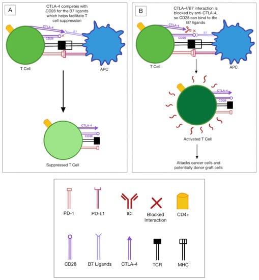 (A) No ICI (B) CTLA-4 inhibitor mechanism. Abbreviations: APC: antigen-presenting cell; PD-1: programmed death-1; PD-L1: programmed death ligand-1; CTLA-4: cytotoxic T lymphocyte-associated molecule-4; CD28: cluster of differentiation 28; ICI: immune checkpoint inhibitor; MHC: major histocompatibility complex; TCR: T cell receptor.