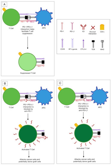 Immune checkpoints involve stimulatory and inhibitory pathways that affect immune cells and maintain a balance between pro- and anti-inflammatory signaling [6]. Cancer cells stimulate inhibitory immune checkpoints leading to a reduction in the normal immune response; thus, the mechanism to suppress cancerous cells is no longer functional [7]. Because the cancer cells have escaped the immune response, they can continue to grow. ICIs function by blocking the effects of specific inhibitory pathways [4]. Because of this overactive immune response, the immune system can target antigenic cells, including cancerous cells and transplanted donor tissue.