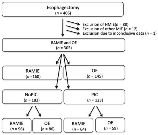 - Scarpa, M.; Cavallin, F.; Saadeh, L.M.; Pinto, E.; Alfieri, R.; Cagol, M.; Da Roit, A.; Pizzolato, E.; Noaro, G.; Pozza, G.; et al. Hybrid minimally invasive esophagectomy for cancer: Impact on postoperative inflammatory and nutritional status. Dis. Esophagus 2016, 29, 1064–1070. [Google Scholar] [CrossRef] [PubMed]