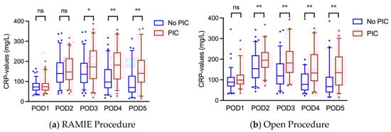 Richter, F.; Mehdorn, A.-S.; Fedders, T.; Reichert, B.; Egberts, J.-H.; Becker, T.; Pochhammer, J. C-Reactive Protein as Predictor for Infectious Complications after Robotic and Open Esophagectomies. J. Clin. Med. 2022, 11, 5654. https://doi.org/10.3390/jcm11195654