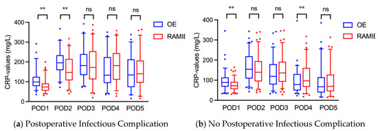 - Babic, B.; Tagkalos, E.; Gockel, I.; Corvinus, F.; Hadzijusufovic, E.; Hoppe-Lotichius, M.; Lang, H.; van der Sluis, P.C.; Grimminger, P.P. C-reactive Protein Levels After Esophagectomy Are Associated With Increased Surgical Trauma and Complications. Ann. Thorac. Surg. 2020, 109, 1574–1583. [Google Scholar] [CrossRef] [PubMed]