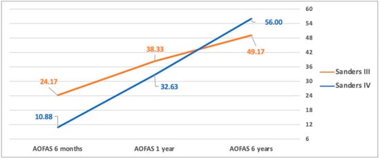 AOFAS score between Sanders types III and IV. The AOFAS score at six months follow-up showed better outcomes in patients affected by Sanders type III fractures (p = 0.03). This difference gradually decreases at one-year follow-up with the tendency to inversion between the two groups, but without statistical significance.