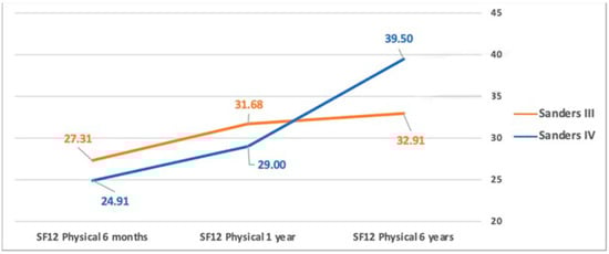 Physical SF-12 score between Sanders types III and IV. Similarly, the AOFAS score at six months follow-up showed better outcomes in patients affected by Sanders type III fractures. This difference gradually decreases at one-year follow-up with the tendency to inversion between the two groups, but without statistical significance.