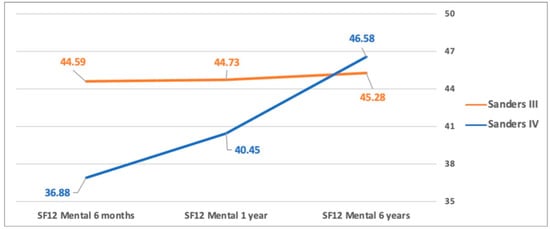 Mental SF-12 score between Sanders types III and IV. Similarly, the AOFAS score at six months follow-up showed better outcomes in patients affected by Sanders type III fractures. This difference gradually decreases at one-year follow-up with the tendency to inversion between the two groups, but without statistical significance.