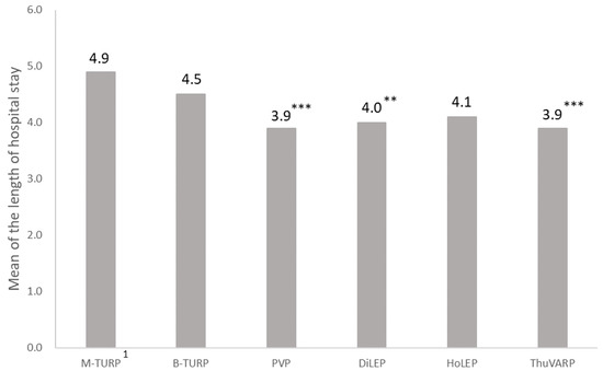 Average length of hospital stay following TURP and laser surgery. ** p < 0.01, and *** p < 0.001 versus M-TURP. 1 M-TURP was the reference group.