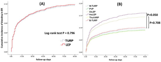 Regarding bleeding events leading to ER visits, the 90-day cumulative incidence following laser surgery was not significantly different from that of TURP (p = 0.796; Figure 3A), and the same was verified between PVP, ThuVARP, and B-TURP and M-TURP. Moreover, the bleeding risk following HoLEP and DiLEP was higher than after M-TURP (p = 0.050, p = 0.708; Figure 3B).