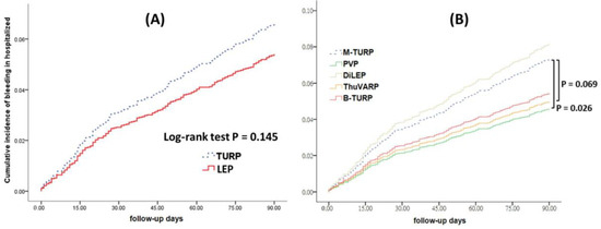 Regarding the bleeding events leading to rehospitalization, the 90-day cumulative incidence post-laser surgery was not significantly different after TURP (p = 0.145; Figure 4A). The cumulative incidence of bleeding events leading to rehospitalization was lower in the PVP and ThuVARP groups than that of the M-TURP cohort (p = 0.026, p = 0.069; Figure 4B).