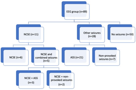 Of the 89 patients, 39 subjects (3% of the total cohort, consisting of 1457 patients at risk) had clinically observed seizures and/or ictal activity verified via EEG. The clinical manifestations that initiated an EEG study in the 50 patients without confirmed seizures were related to unspecific non-epileptic movements or oral automatisms, prolonged actions of anesthetics or opioids or symptoms associated with cerebral embolic or hemorrhagic injury. Eleven patients (0.8%) developed NCSE. Six of them showed isolated NCSE, whereas five patients had foregone clinically observed seizures, either in the form of acute symptomatic seizures (ASS), occurring within the first 7 days after a specific insult, or unprovoked seizures. Another twenty-one patients from the EEG group exhibited only ASS and seven patients developed non-provoked seizures further along the line (Figure 1). In the EEG cohort comprising 89 patients, none had psychogenic or any other kind of non-epileptic seizures. Within the EEG group there was no statistically significant difference between patients with or without NCSE in regard to demographic, perioperative, and outcome data. Perioperative cerebrovascular insults were frequently seen in patients with NCSE. Cranial computed tomography (CCT) documented new ischemic stroke or hemorrhage in eight of 11 patients with NCSE (57%), whereas CCT results demonstrated insults in 6 of 28 patients with other types of seizures (21%) and in 14 of 50 patients without seizures (28%, p = 0.01). Ischemic strokes were observed in 2 NCSE, 2 NCSE + ASS, 3 ASS and 13 patients with no seizures, whereas hemorrhagic insults could be verified in 1 NCSE, 1 NSCE + non-provoked seizures and 3 non-provoked seizures patients, as well as in 1 patient without seizures. Ischemic lesions next to hemorrhagic insults were detected in the CT scans of two patients with isolated NCSE.