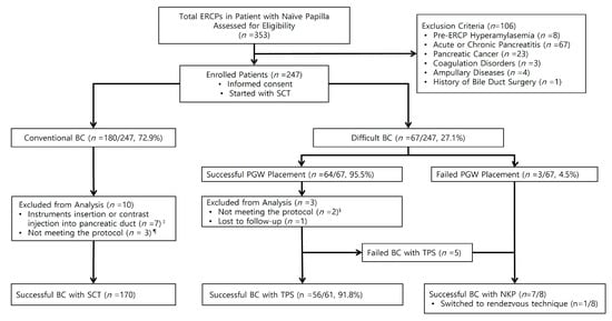 - Kim, C.W.; Chang, J.H.; Kim, T.H.; Han, S.W. Sequential double-guidewire technique and transpancreatic precut sphincterotomy for difficult biliary cannulation. Saudi J. Gastroenterol. 2015, 21, 18–24. [Google Scholar] [CrossRef]