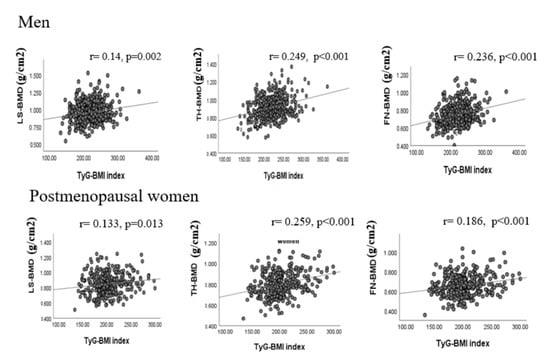 Figure 1 shows the correlation of TyG-BMI with BMD at different sites. In men, TyG-BMI was positively correlated with femoral neck BMD (r = 0.236, p < 0.001), total hip BMD (r = 0.249, p < 0.001), and lumbar spine BMD (r = 0.145, p = 0.002). Similarly, in women, TyG-BMI was positively correlated with femoral neck BMD (r = 0.186, p < 0.001), total hip BMD (r = 0.259, p < 0.001), and lumbar spine BMD (r = 0.133, p = 0.013). In both sexes, the association persisted even after adjusting for age, smoking, drinking, and history of previous hip fracture or parental hip fracture.