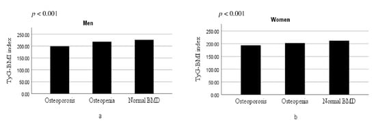 Distributions of the TyG-BMI according to the bone health status in men (a) and in women (b).