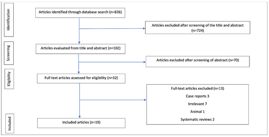 An initial search identified 826 articles; 32 were selected from an analysis of the title and abstract for full-text review. In total, 3 were excluded as they were case reports with fewer than 3 participants, 2 were systematic reviews, 7 were irrelevant, and 1 was an animal study. After an analysis of the full text, 19 were included in our final review (Figure 1); 12 aminoglycoside and 7 aminoglycoside-polymyxin articles (Table 1 and Table 2).