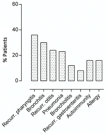 As shown in Table 2, during FU, pharyngitis was the most frequently reported infection, being recorded in 20.3% of patients, followed by bronchitis (20.3%), gastroenteritis (12%), otitis media (17.2%), and urinary infections (6.3%). Only two patients experienced pneumonia during the follow-up (3.1%). Twelve percent (n = 8) of participants underwent adenoidectomy and/or tonsillectomy before enrollment and during the FU. Overall, 151 antibiotic courses in 33 patients were prescribed during the study time. Moreover, 25% (n = 17) had a diagnosis of asthma, of which 10 patients did not show any allergic sensitization. All except one were classified as intermittent asthma, the other as mild persistent.