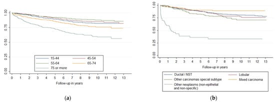 The strength of this study is that the sample was population-based, with high-quality data, as the negligible percentage of missing cases in terms of survival information and the minimal differences observed between cancer-specific and relative survival show. In our research, clinical records of each case were reviewed by trained professionals. We followed some of the cases for up to 13 years. Moreover, we knew the cause of death, which allowed us to calculate cause-specific survival. The application of the competing-risks model instead of the Cox model used in other studies [] made it possible to obtain more realistic estimates of the risk of dying from breast cancer, considering that there are obviously patients who die from other causes. On the other hand, it was possible to collect a pathological diagnosis in many cases, which is unusual compared to other tumors which are frequently diagnosed by imaging or other clinical tests.
