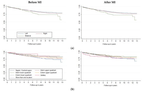 In our study, breast cancer survival was associated only with age over 65, triple negative, and stage. Furthermore, the competing risks regression model showed that, in contrast, neither sublocation nor laterality affected survival after MI. However, other studies have found a relationship between sublocation and survival [].