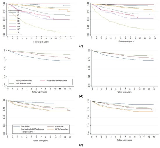 Survival curves of breast cancer by (a) laterality, (b) sublocation, (c) stage, (d) histologic grade and (e) molecular classification, before and after Multiple Imputation (MI) (m = 5).